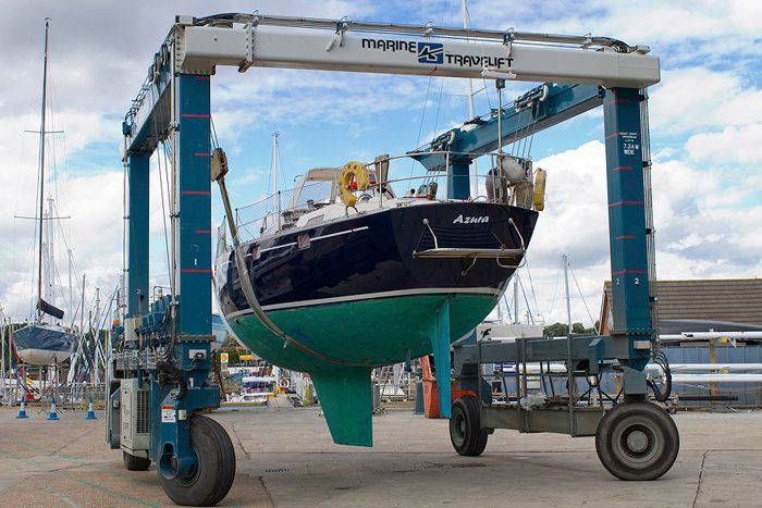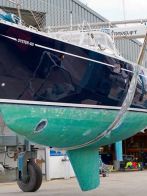 Recently purchased from Oyster Brokerage, Morris Scally’s Oyster 435, Azura, has already been into Fox’s spray booth and emerged with a brand new coat of AwlGrip Flag Blue with Snow White Boot Top and Coveline. After leaving the spray booth she has gone straight into the Osmosis Workshop to have her bottom finished.