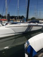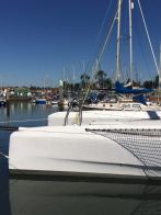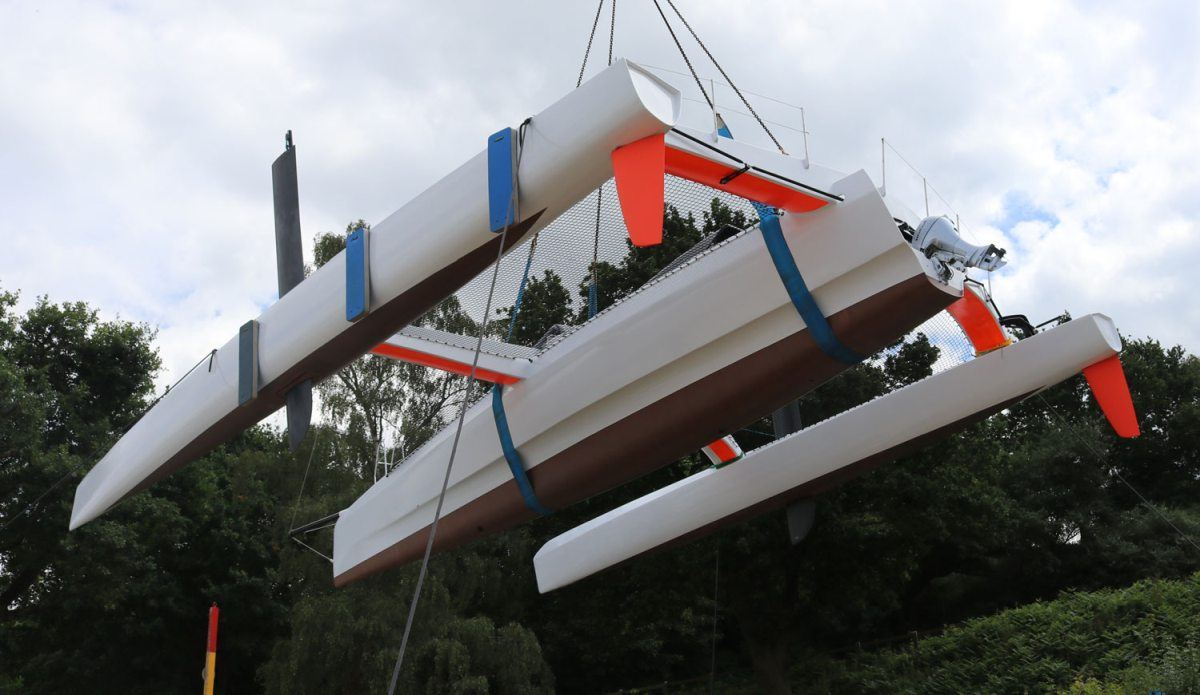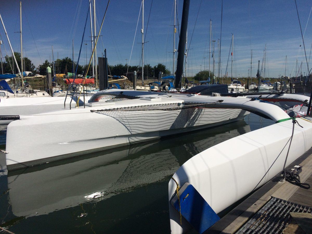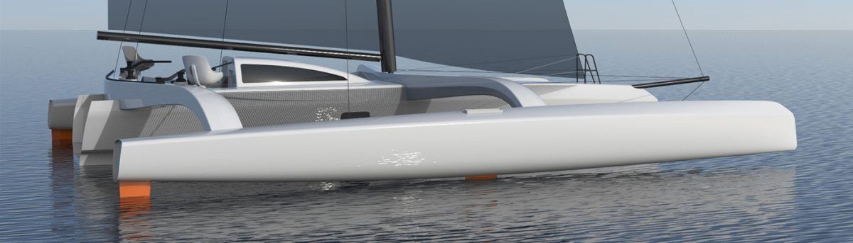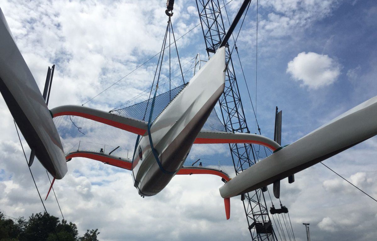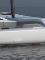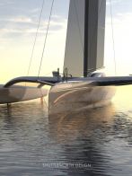 Her 18.6m canting and rotating wing mast supports a total sail area of 190m2 and the entire vessel is engineered for full carbon/foam construction to achieve an exceptionally light weight of 2200kg. The outrigger volume is close to 300% of the displacement providing increased reserve buoyancy and an optimised hull shape for flying the main hull.