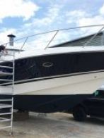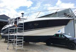 The first Sunseeker into Fox’s environmentally controlled sprayshop underwent glass and epoxy laminate repairs, and re-fairing and finishing of the sheerbands in the traditional Sunseeker navy colour scheme. A Jotun Megagloss topcoat gives that ‘mirror-like’ shine and ‘wow factor’. Then with a hand buffing of all the bright work, the finished yacht looks as good as new!