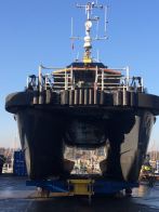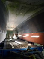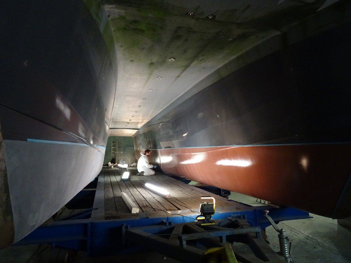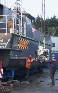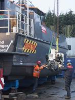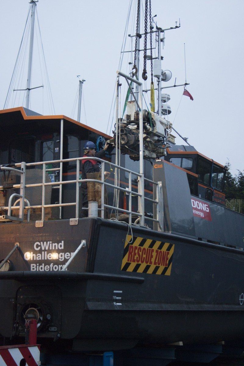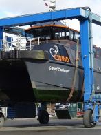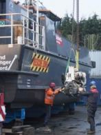 Our first task was to release and lift CWind’s wheelhouse, which is designed and built as a modular pod, allowing the starboard engine to be craned out and a replacement engine installed. She was then carefully moved to the Fox’s blasting bay so that her composite hulls could be soda blasted and prepared for Coppercoat, whilst the alloy jet drive components were cleaned up and prepared for finishing with International Paint’s latest Fluoropolymer foul release coating.