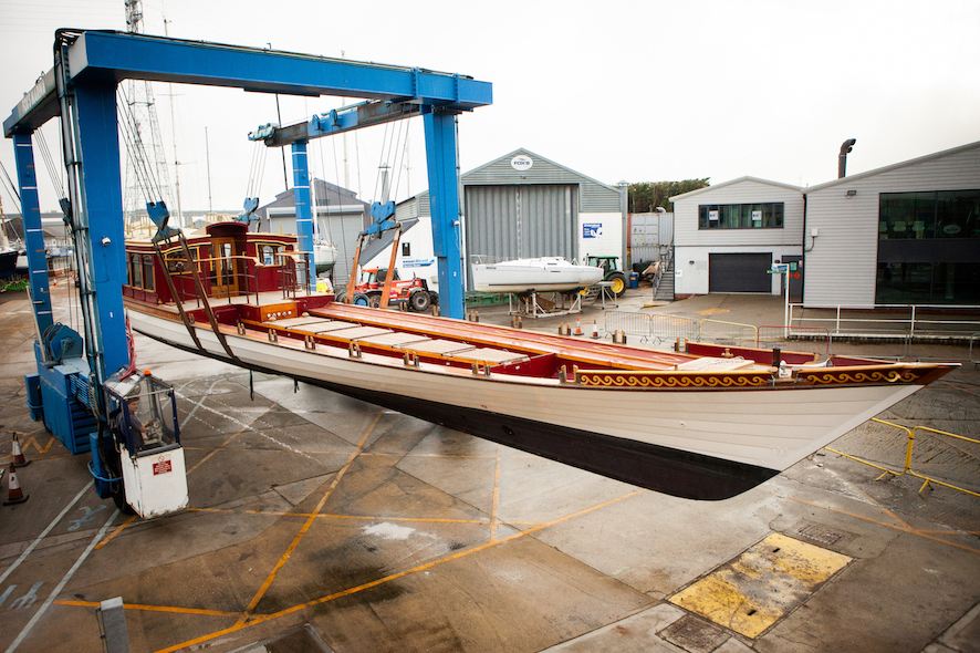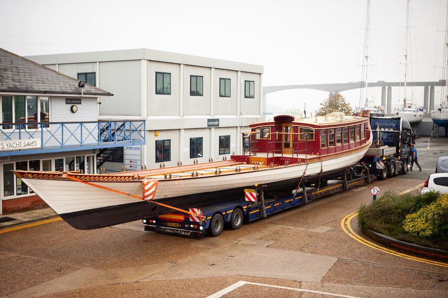 This very special vessel travelled by road from the River Thames to Fox’s where she will undergo a carefully managed winter refit. The work planned involves complete re-finishing of topsides, bottom and all exterior surfaces including the specialist application of two pack paints, varnishes and gold leaf. Fox’s state-of-the-art heated workshops have the capacity for vessels up to 100ft long, so at 88ft Gloriana fits comfortably in her secure temporary home for the next couple of months.