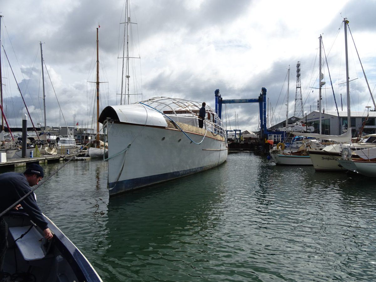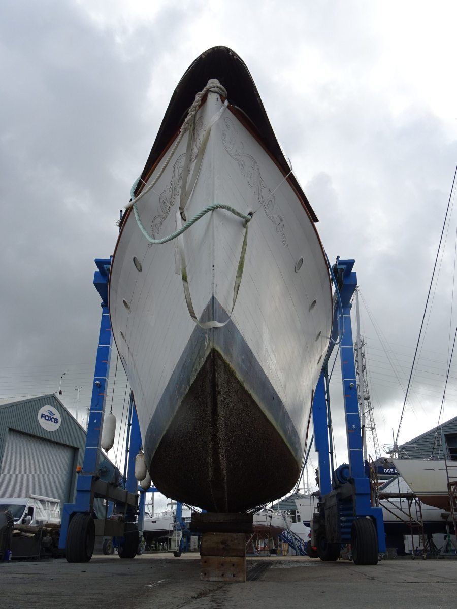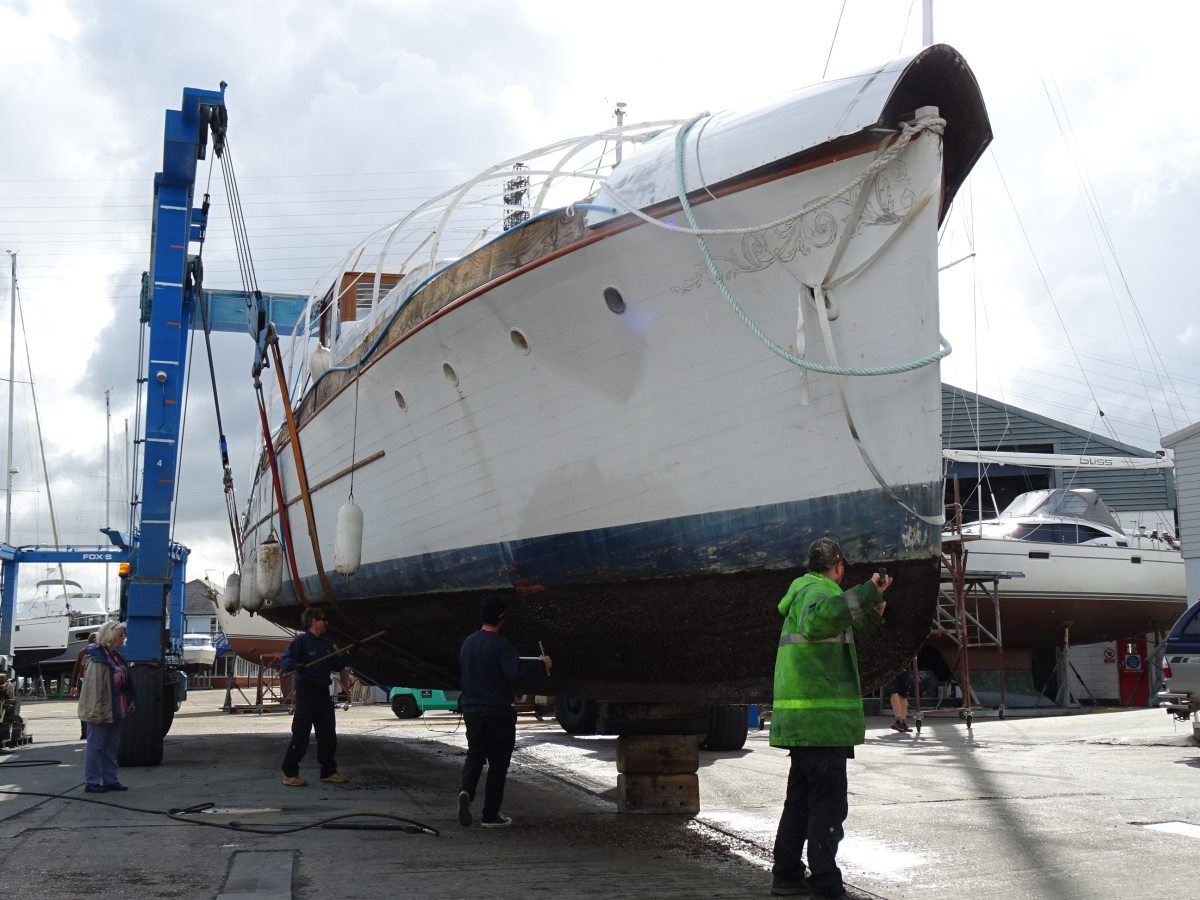 The magnificent and historic 87′ LOA motor yacht, Ginger-Dot, originally built and launched in 1922 by the Luders shipyard in Stamford Connecticut, USA, arrived safely at Fox’s Marina & Boatyard this week having been expertly towed by Tam and Ben Grundy from her mud berth in the River Deben at Melton, near Woodbridge.