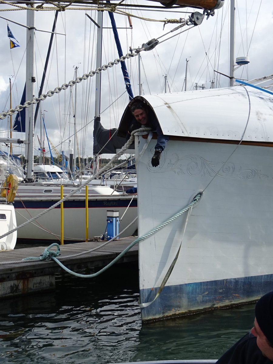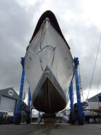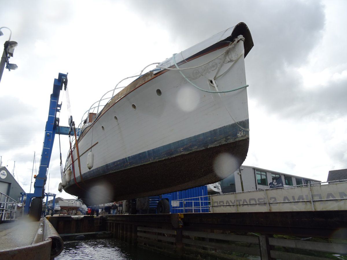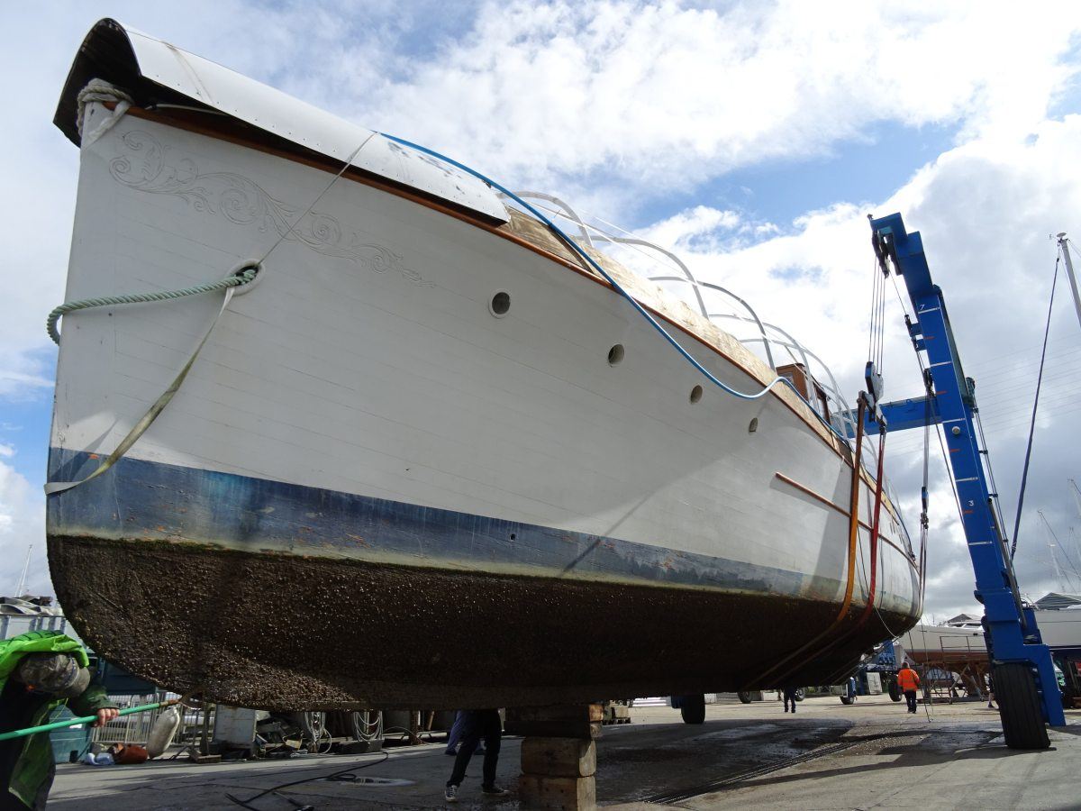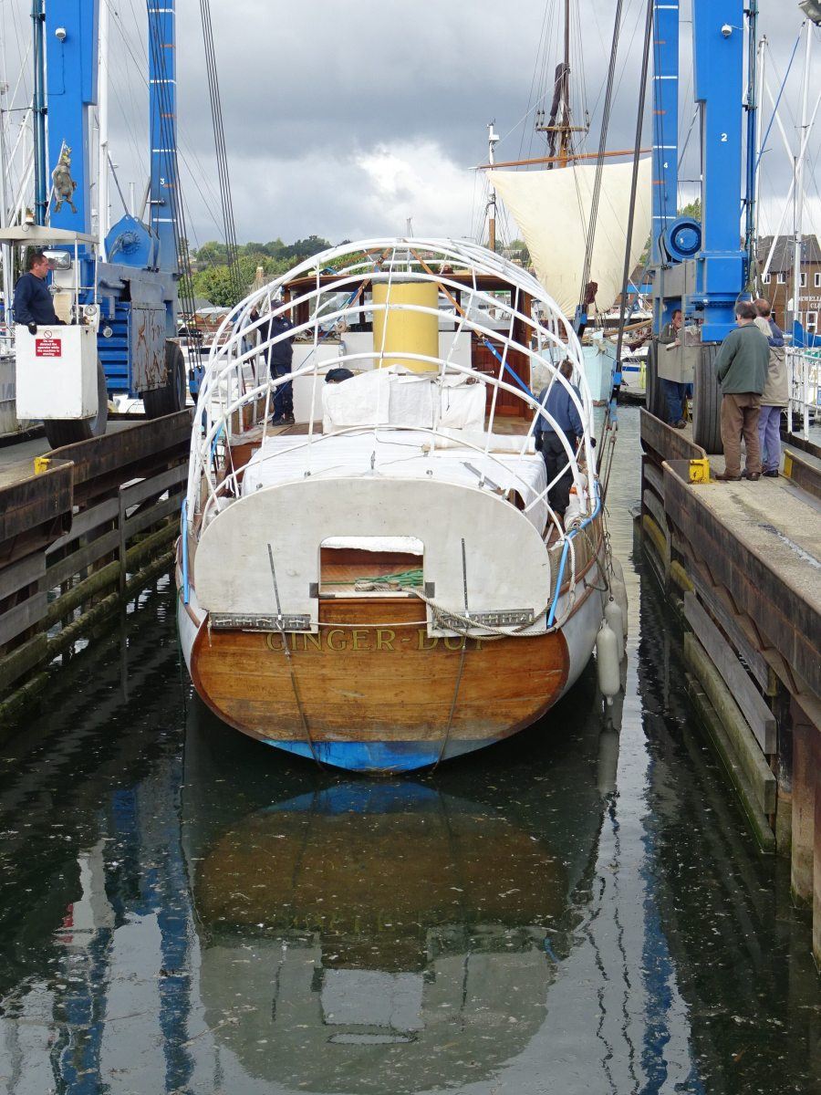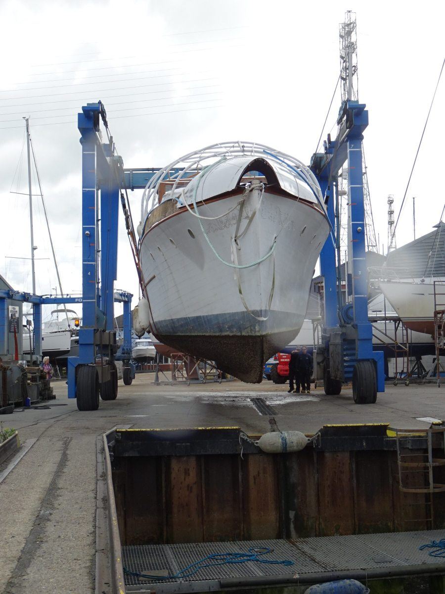 Ginger-Dot has now been hauled, the first time she has been out of the water for over 15 years and, after a careful scrub down and pressure wash, she was delicately manoeuvred by our mighty travel lift into her new home at Fox’s, where she will remain whilst her owners, Susan and Angus Clark, continue with their meticulous restoration work.