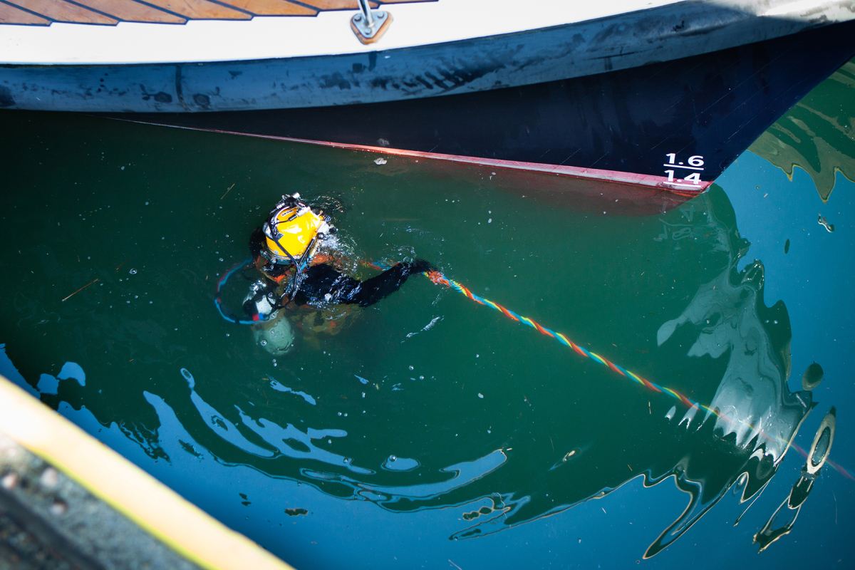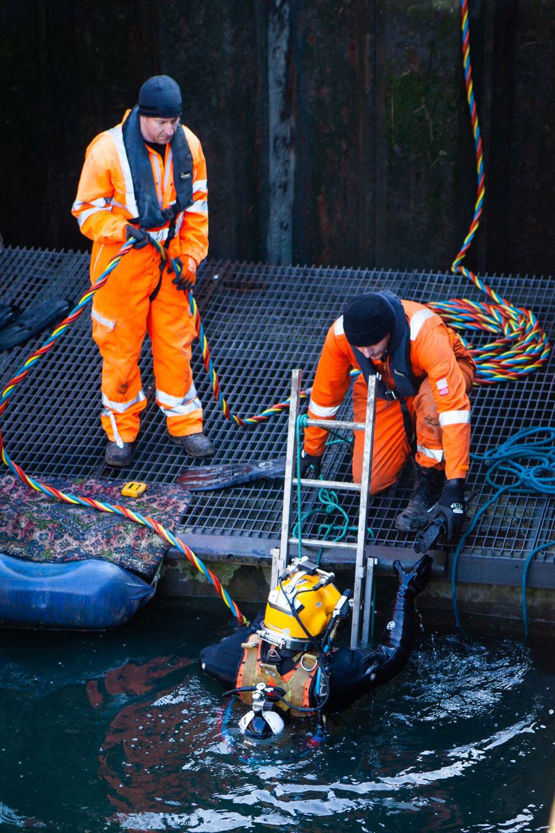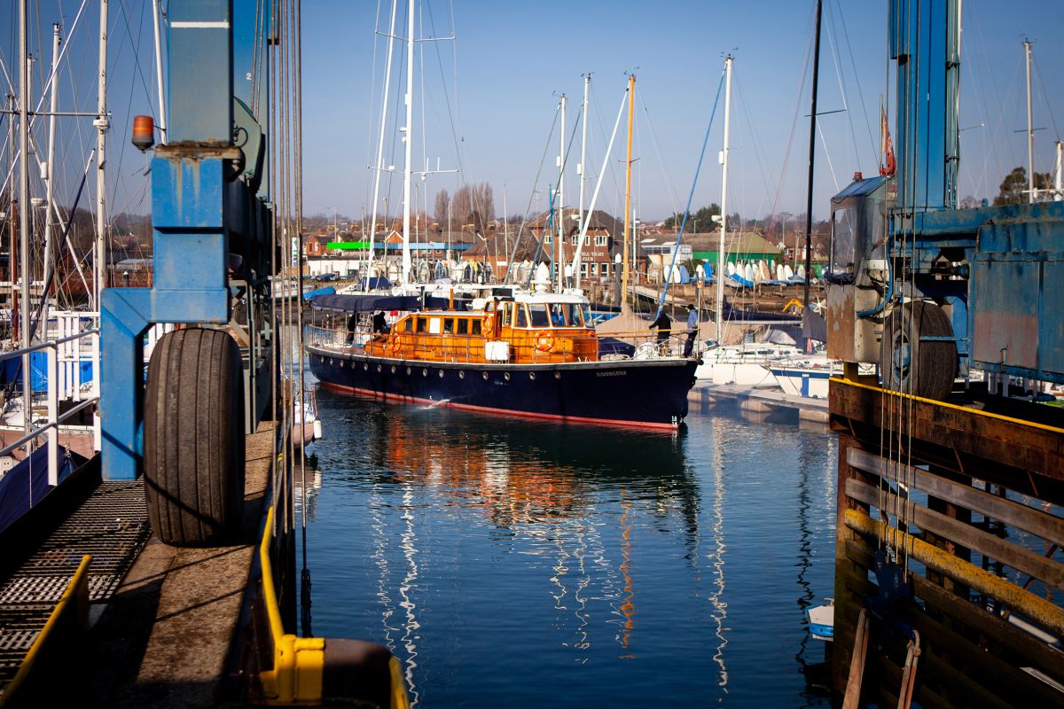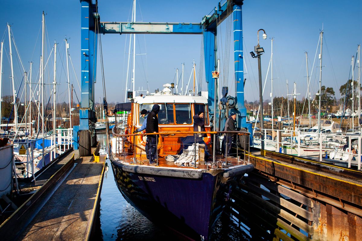 Once a suitable weather and tide window is agreed upon, crew and staff are briefed, and checks on Fox's 70-tonne hoist are completed. The custom 3000kg lifting beam is then lowered into the lift dock, and with the help of a five-person dive team on site, Havengore is carefully positioned over the beam and gently lifted clear of the water.