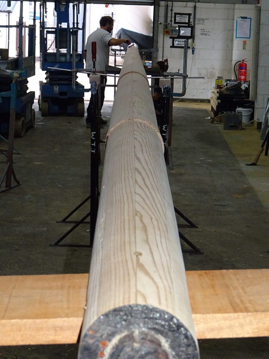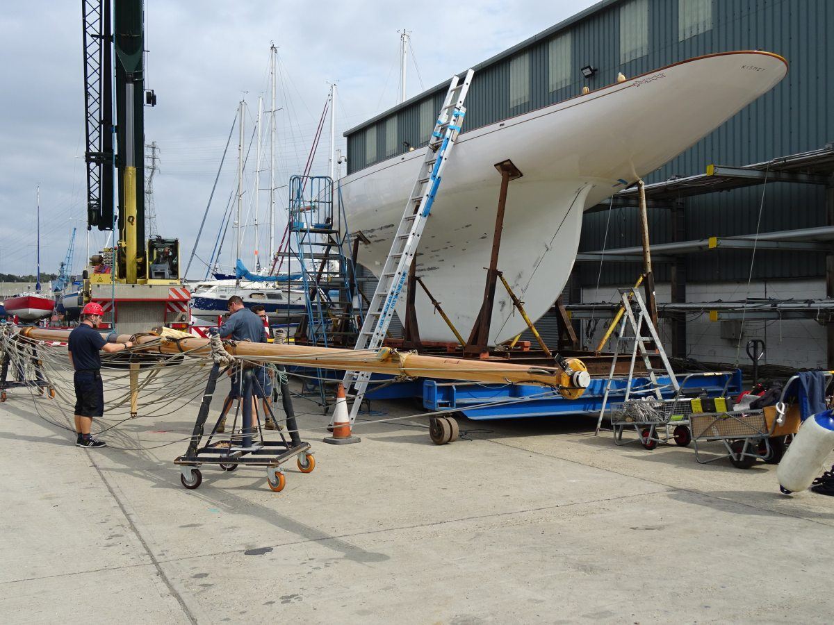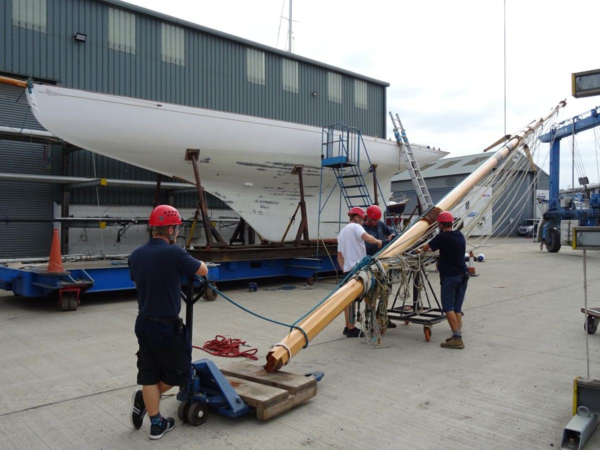 The team of Fox’s skilled shipwrights have been enjoying working on the refit of the beautiful, classic, wooden Fife, Kismet, this year, which has included the refurbishment of her wooden main mast, re-varnishing, replacing copper rivets and custom leatherwork, all carried out inhouse by the Fox’s team.