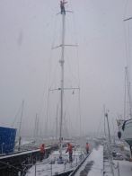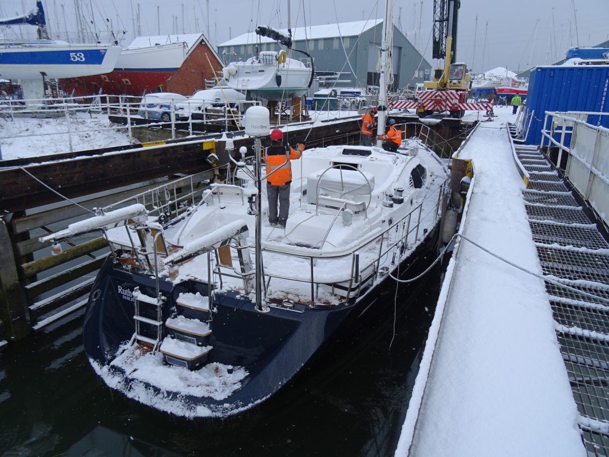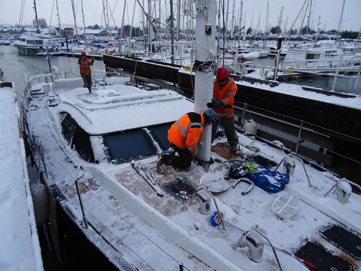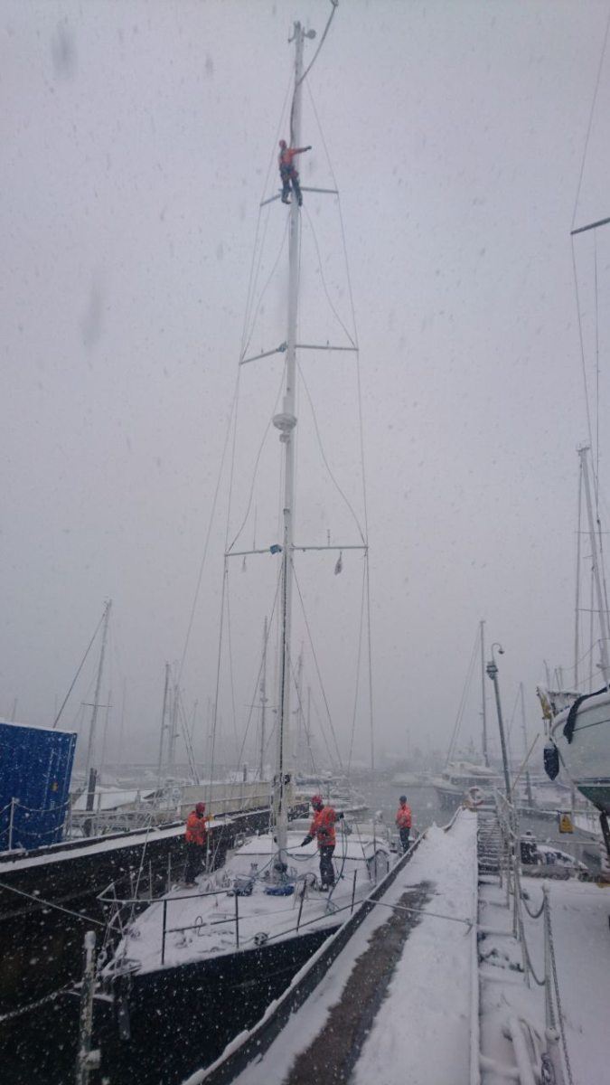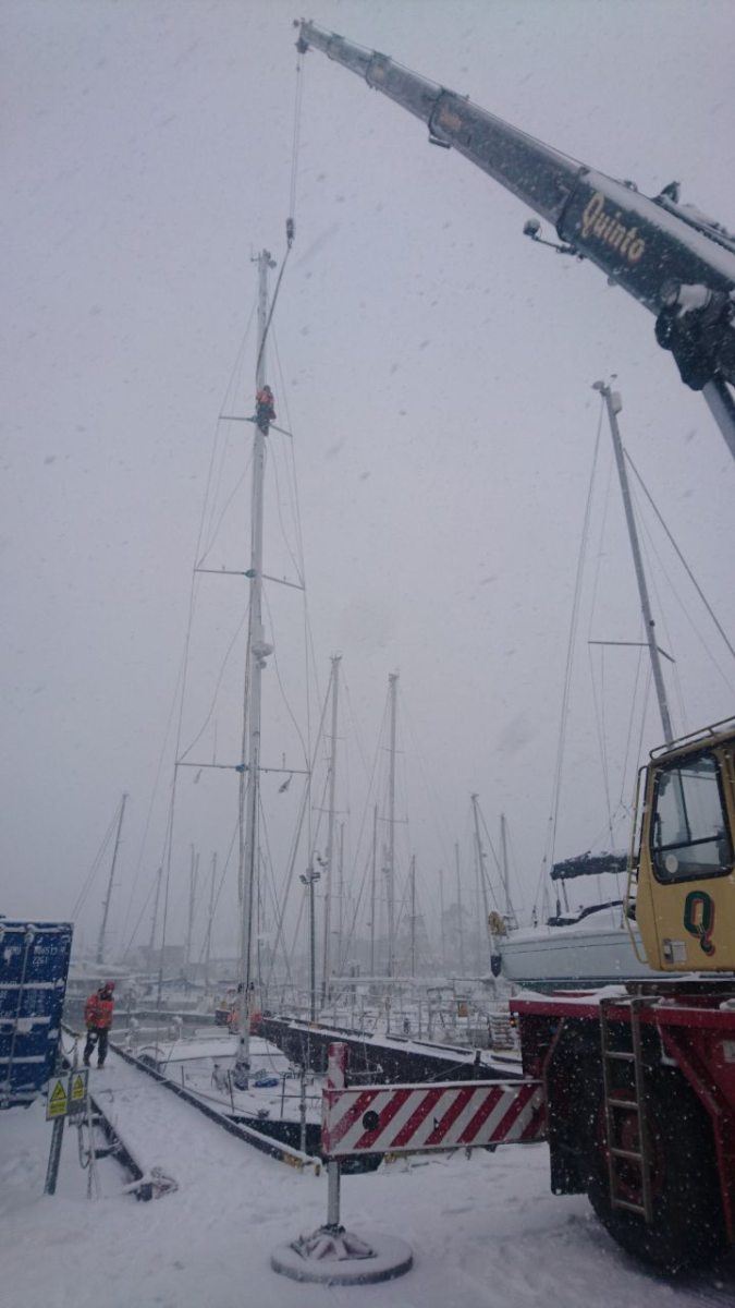 The ‘Beast from the East’ may have brought many areas of the UK to a standstill, but despite the heavy snowfall and bitingly cold temperatures, it’s business as usual here at Fox’s Marina & Boatyard today as our dedicated rigging and marina teams work hard to rig, launch and commission this beautiful new Oyster 625, Ruth II, ready for handover to her owners later in March.