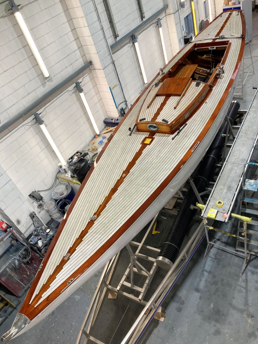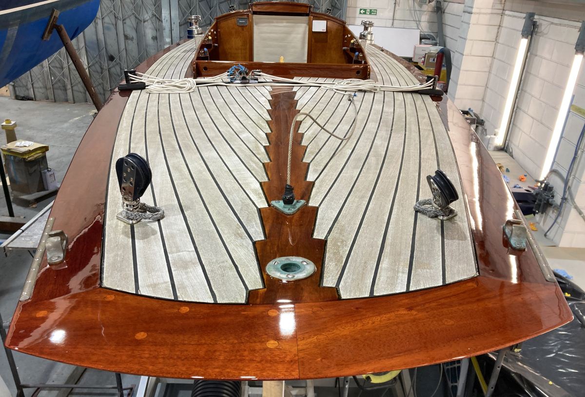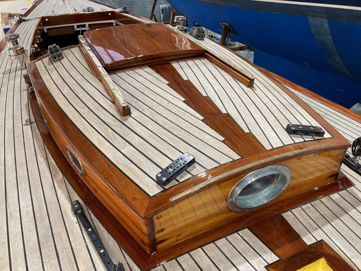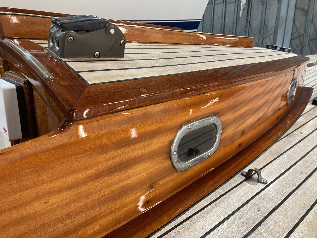 This much-loved 1958 International One Design, Mitzi, has been turning heads since she emerged from Fox’s Sprayshop following an extensive recoating of brightwork. She looks stunning and fully prepped for a full racing and cruising season. The photos below show the full extent of her beautiful varnishwork.