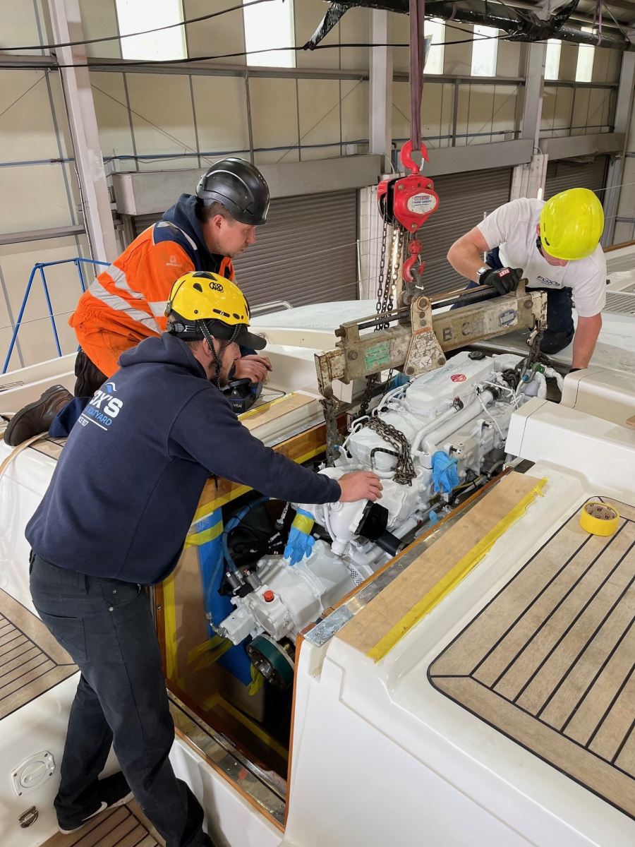 The photos show her new being engine fitted - quite a challenging lift overseen by Fox’s engineering supervisor, Mark Talbot, supported by some skilful manoeuvring by Roy Humphrey's crane team.