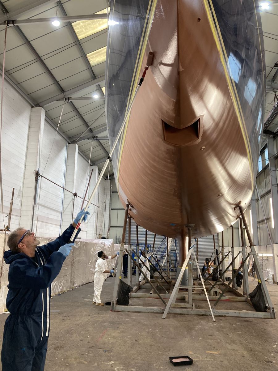 The extensive refit has started on this Oyster 885 and Fox’s workshop staff pulled out all the stops, working in shifts to Coppercoat the boats vast underside.