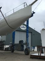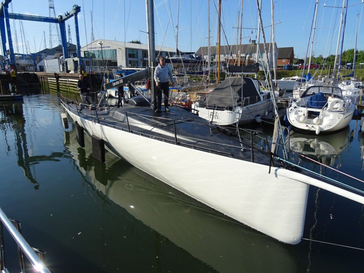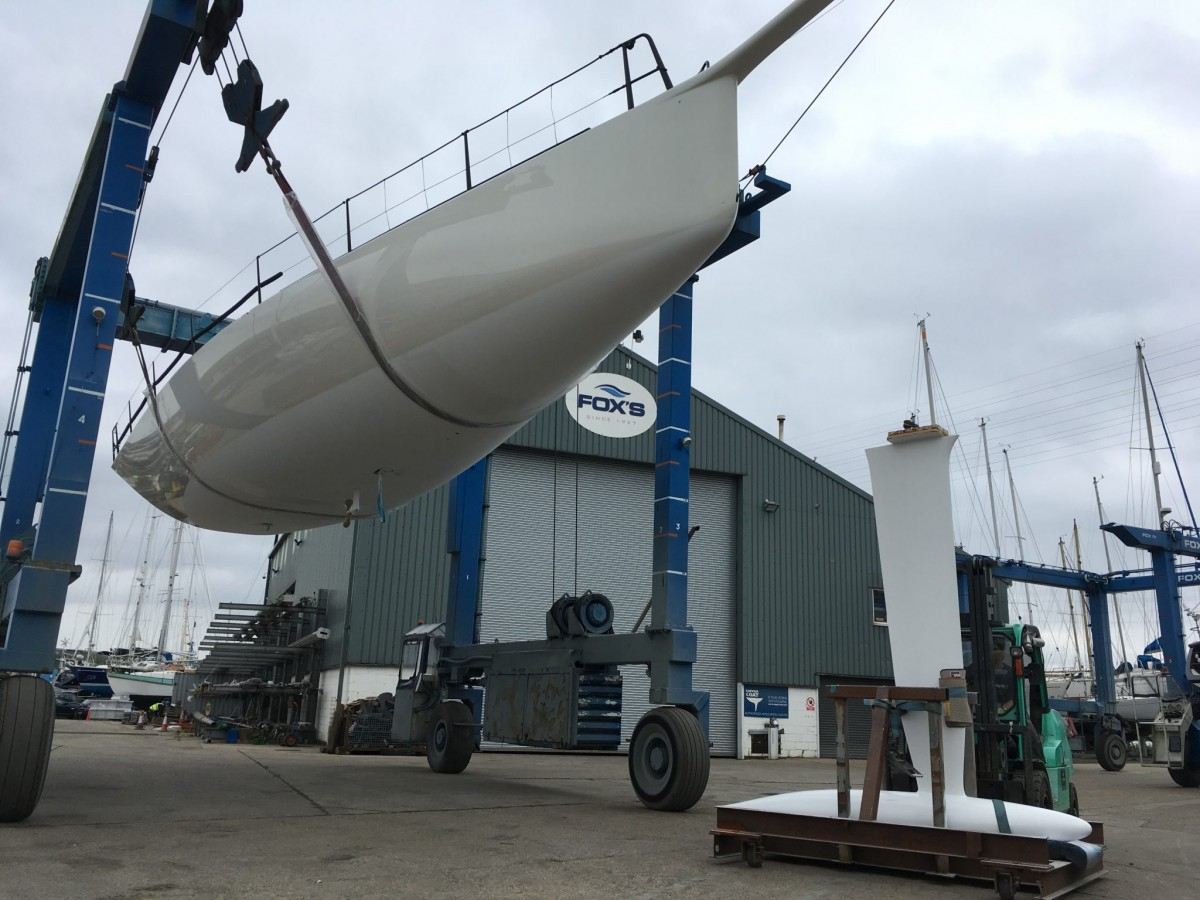 Her previous owner had retired from sailing and the yacht had been laid up for over a year before arriving at Fox’s Marina & Boatyard by road for re commissioning. Work has included topside and underwater painting, exchanging the keel bulb and re installation of keel, rudder and steering system. Repairs to composite standing rigging and rewiring and upgrading her electronics. Fox’s also undertook modifications to the carbon mast to accommodate a reaching strut and fitted B&G plotters at the steering pedestals in custom housings made by Fox’s.