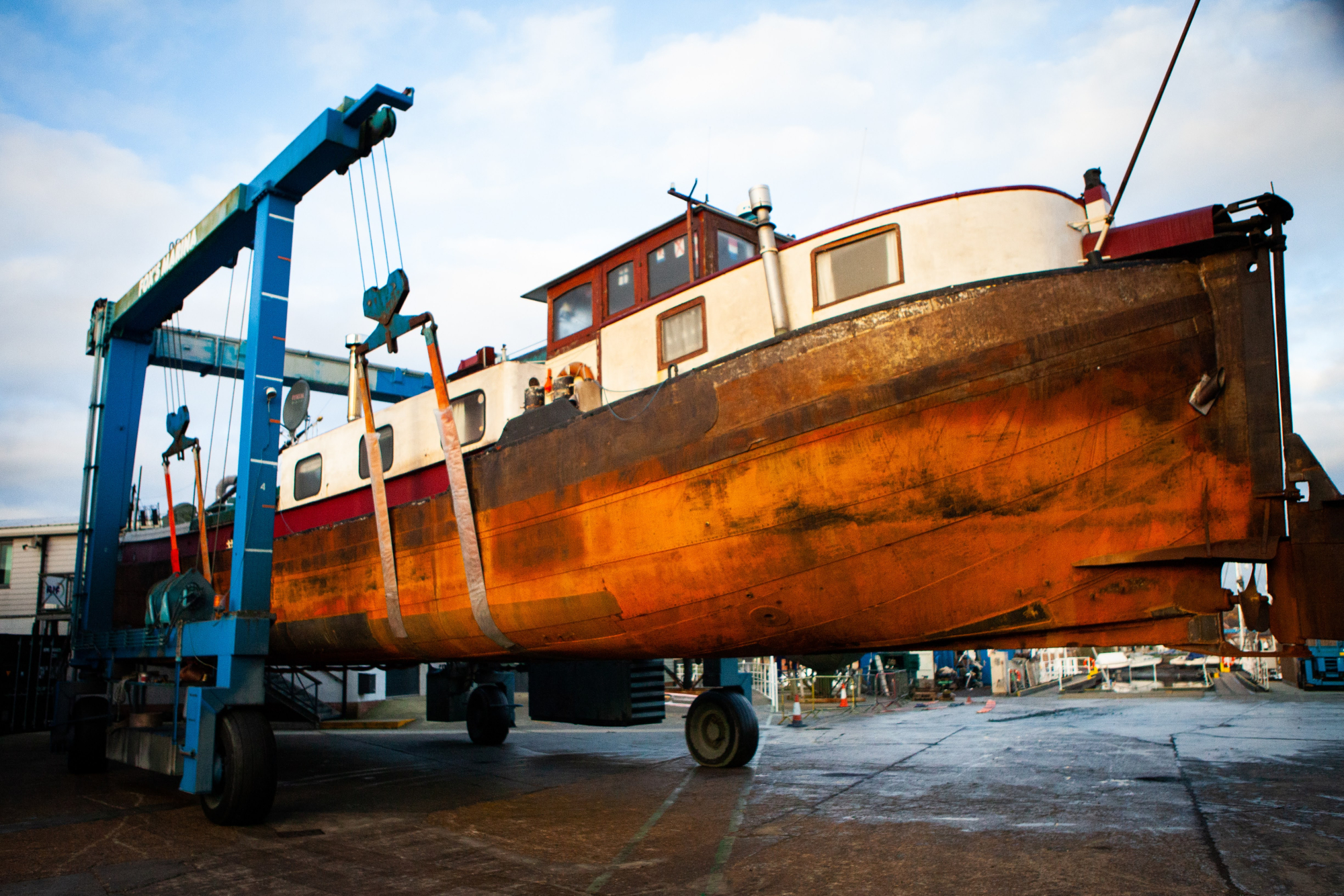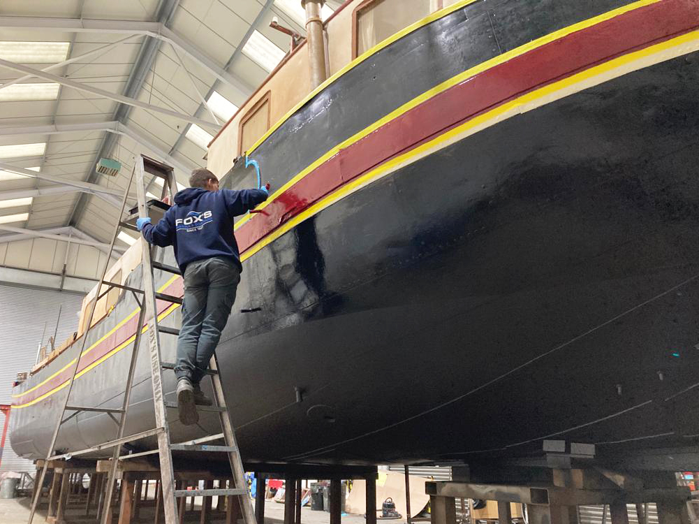 The 140 year old lady was then moved undercover for dry blasting and application of epoxy primer and final coatings, using Jotun’s paint system, in a temperature controlled environment. Repairs to hull plating below the waterline and the cabin sides was carried out, along with new anode studs and anode replacement. Finally, having finished all cosmetic paintwork, the vessel was re sign written as per original.