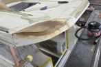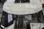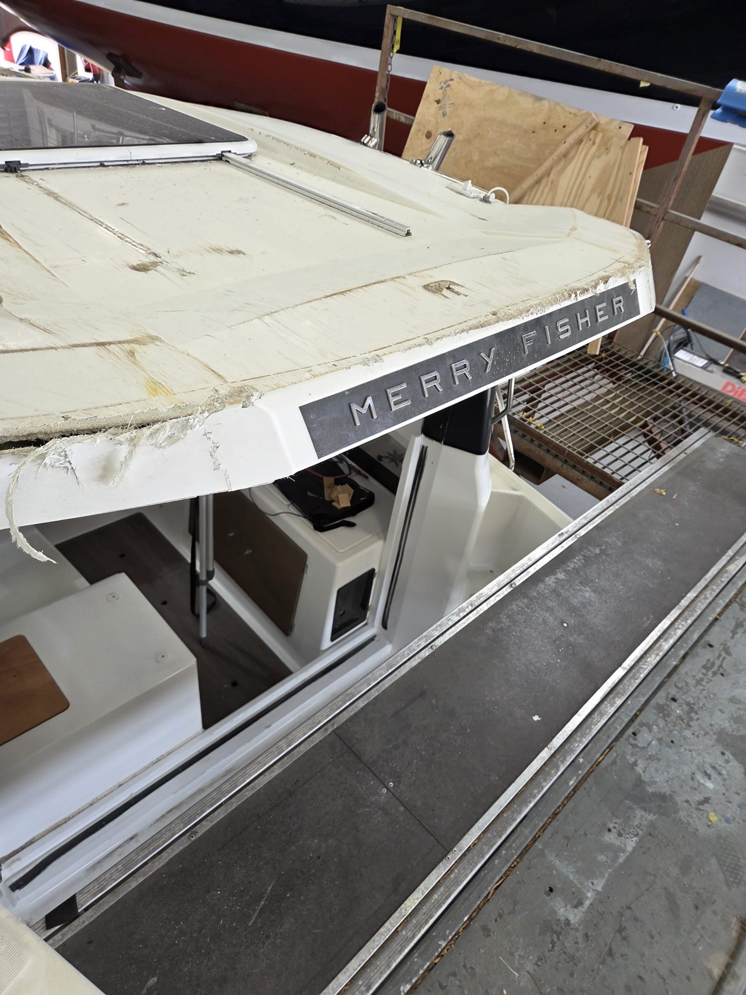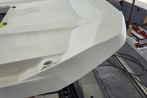When this Jeanneau Merry Fisher 695 arrived at Fox’s, she was in a sorry state. After sustaining significant impact damage, the transom and wheelhouse had been left badly crushed.