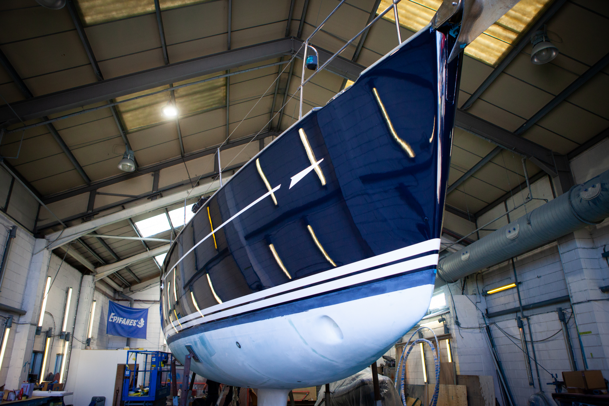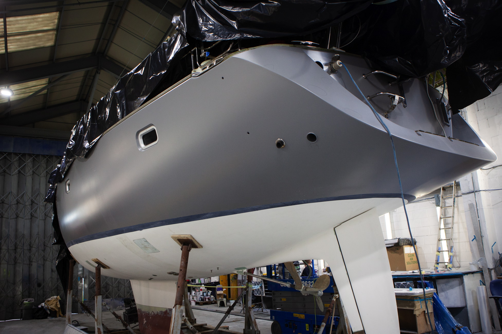 The photos below show work to the topsides and anti-fouling of her bottom. Other work included refinishing of the superstructure, spars and new standard rigging, servicing of engine systems and repainting the non-slip deck. Her owners plan to cruise locally before heading off for some Bluewater cruising.
