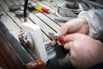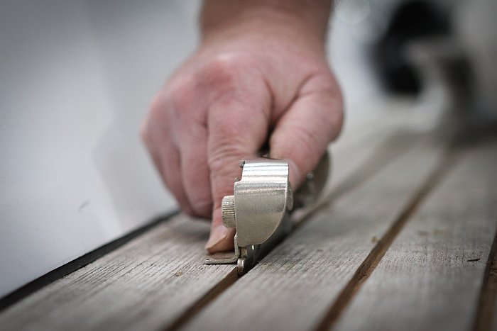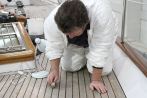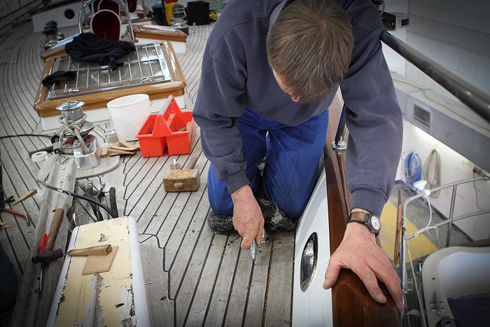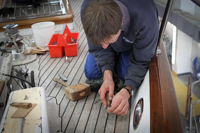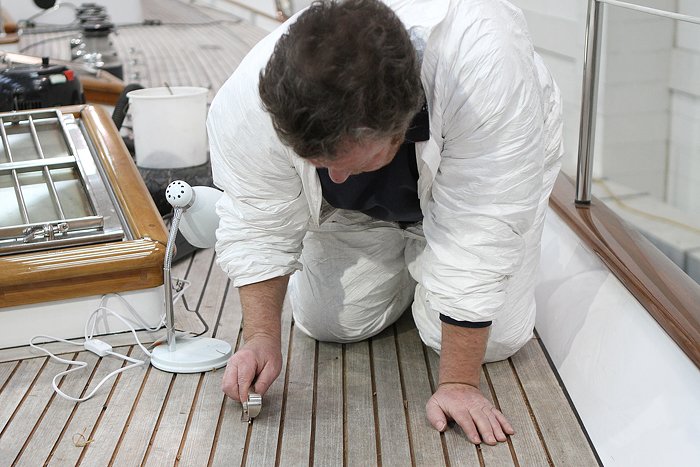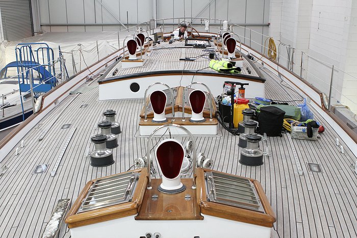 The long job of re-caulking the decks of the beautiful yacht Thula, a 72 foot Royal Huisman, has begun at Fox’s Workshops. Thula is here at Fox’s for raking and re-caulking of decks, varnish work and spray work.