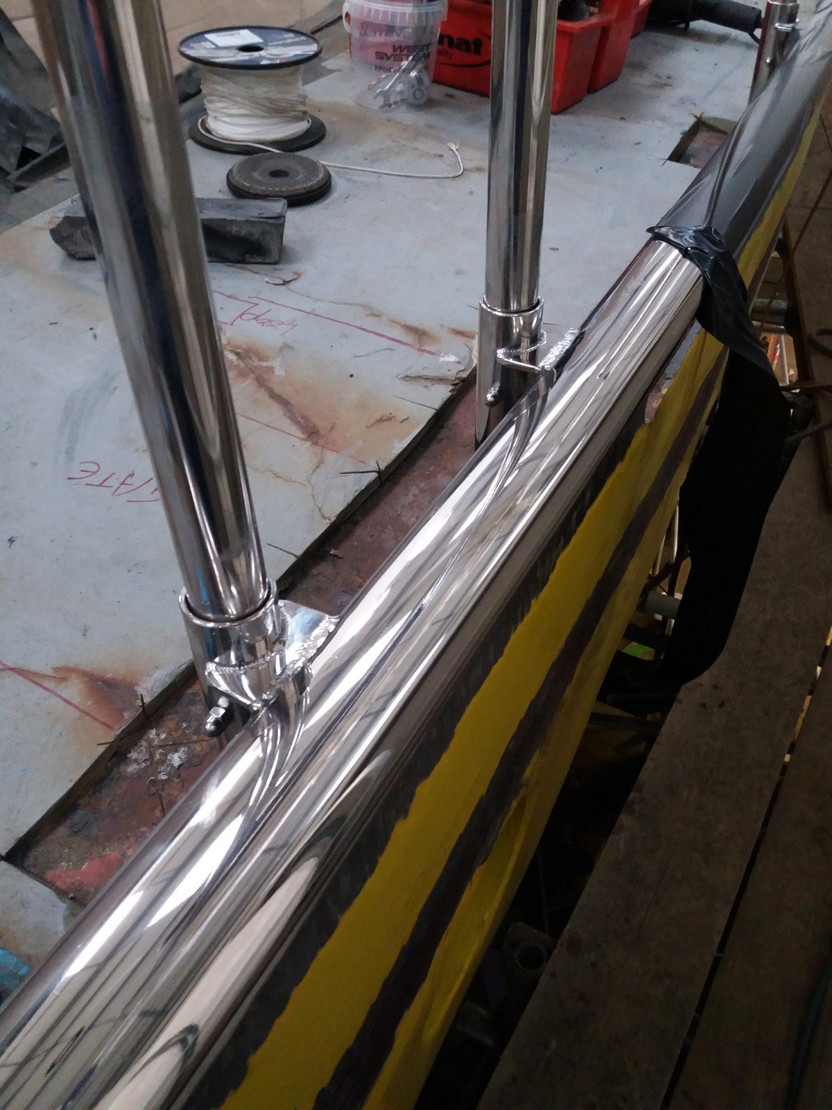 - The original steel rubbing strake, cap rail and stanchion bases were all removed and the remaining hull cleaned up.
