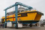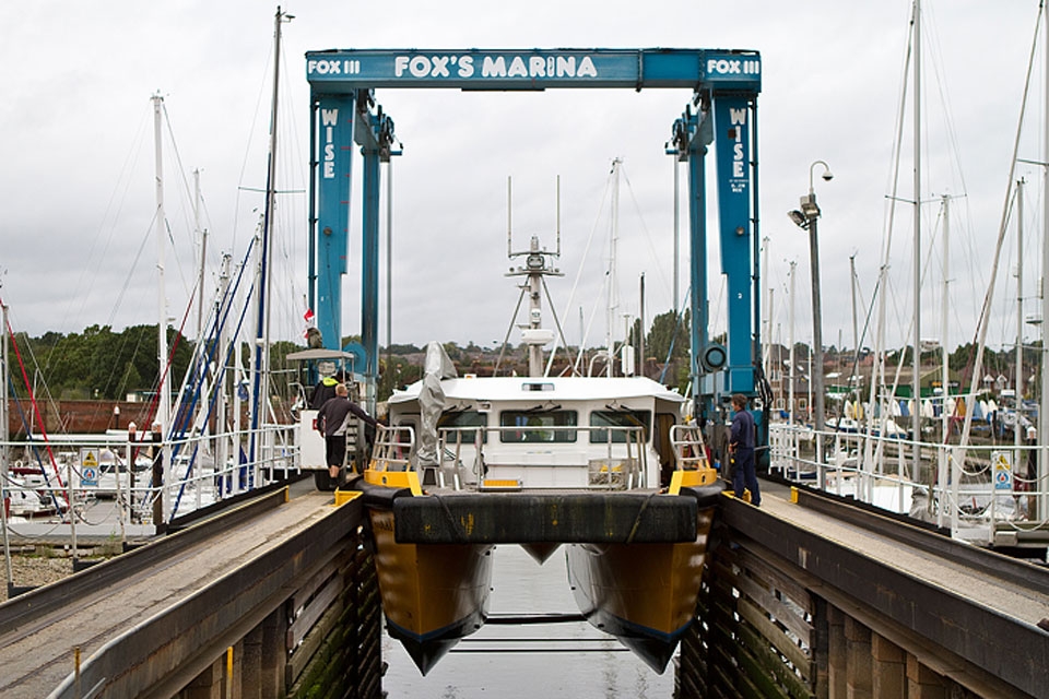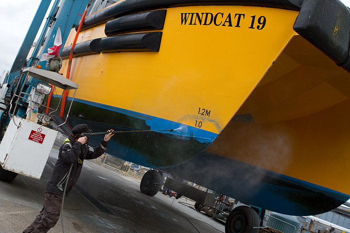 Windcats approached Fox’s as we are the only marina in the area which has the machinery to lift out these sizable craft. The Windcats are 15m in length x 6.1m wide and must reach certain average speeds to fulfil their contracts, so if you pass these bright yellow craft in the River Orwell you will know they are on their way to Fox’s Marina to be scrubbed so they can retain their speed.