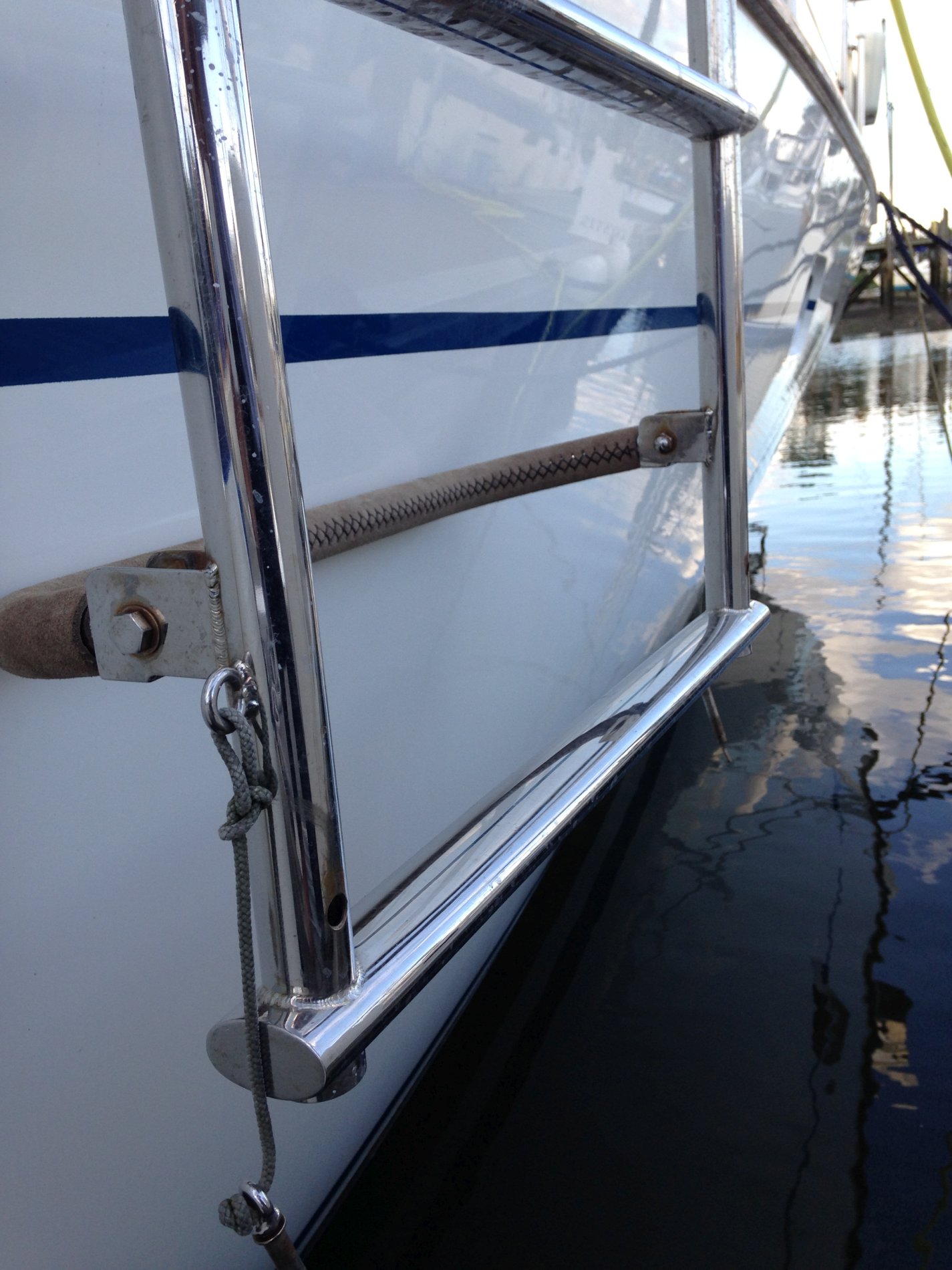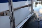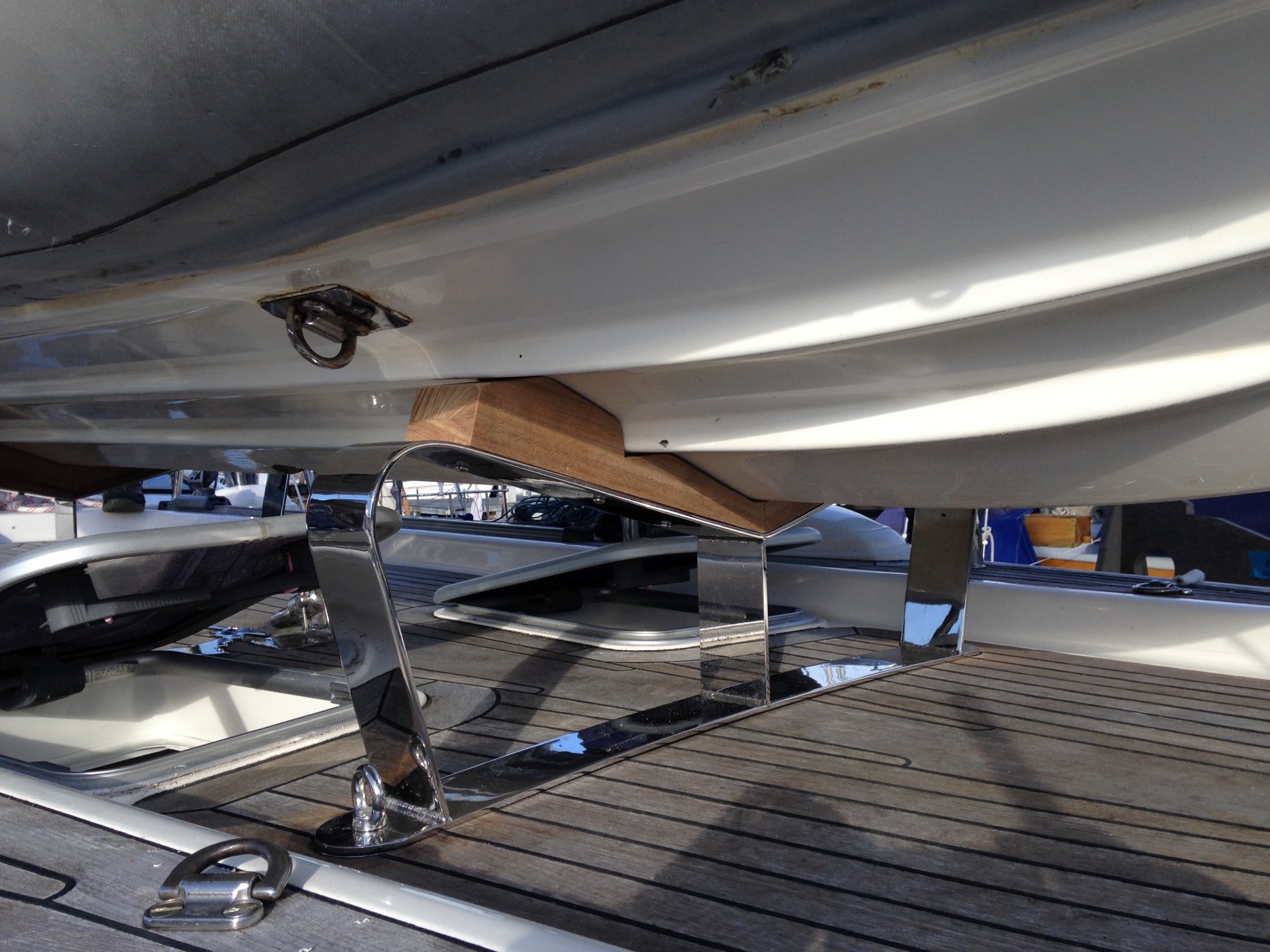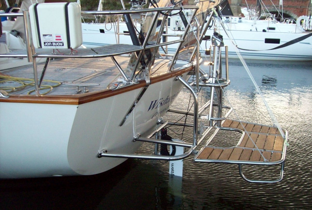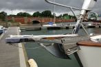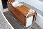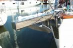 The bathing platform design was modified to accommodate a Watt & Sea generator and Monitor windvane, and bespoke dinghy chocks in stainless steel and teak were fitted to the foredeck. The Fox’s engineers were kept busy with a complete rebuild of the sterngear, including removal and servicing of the Aquadrive unit.