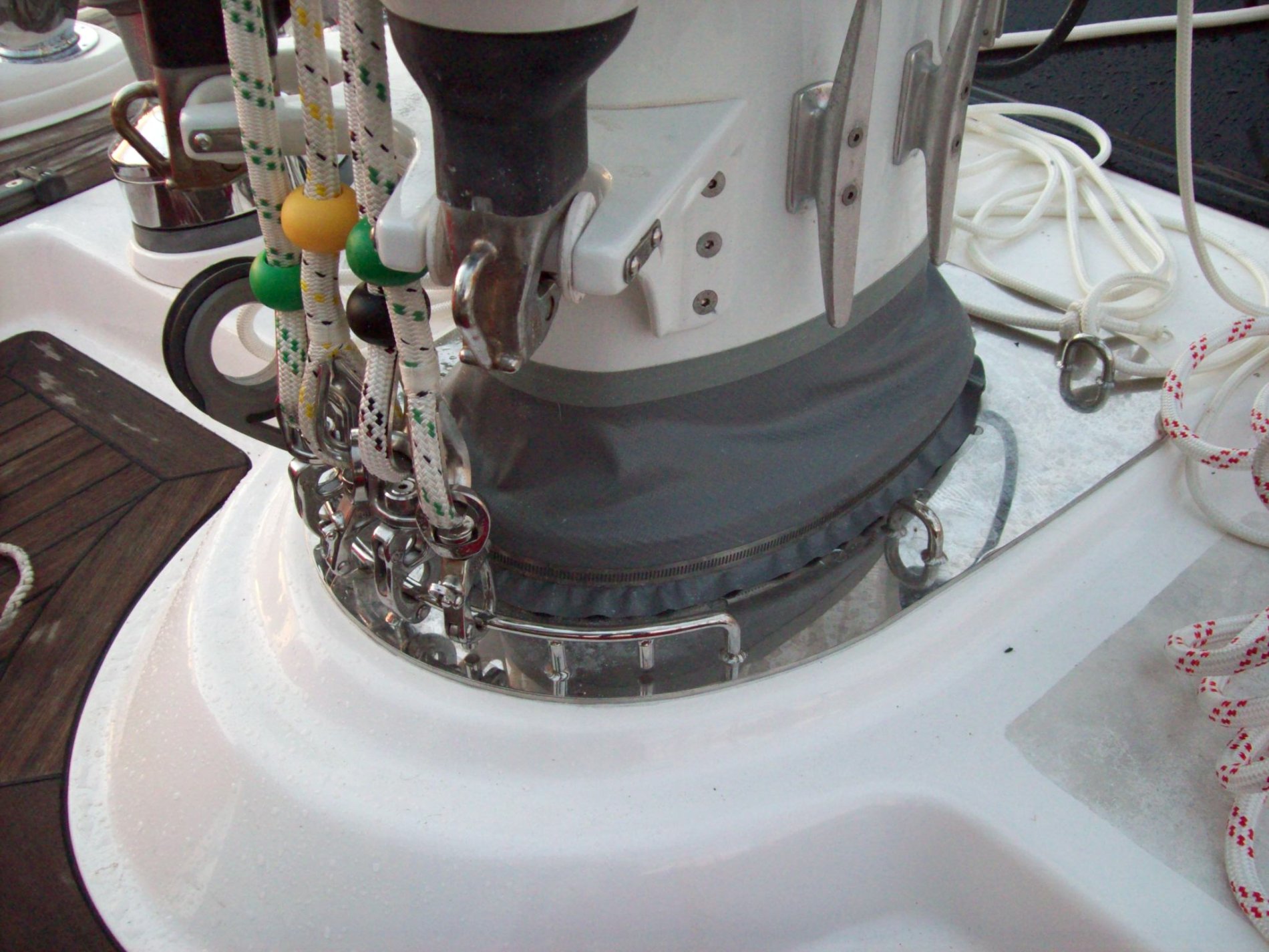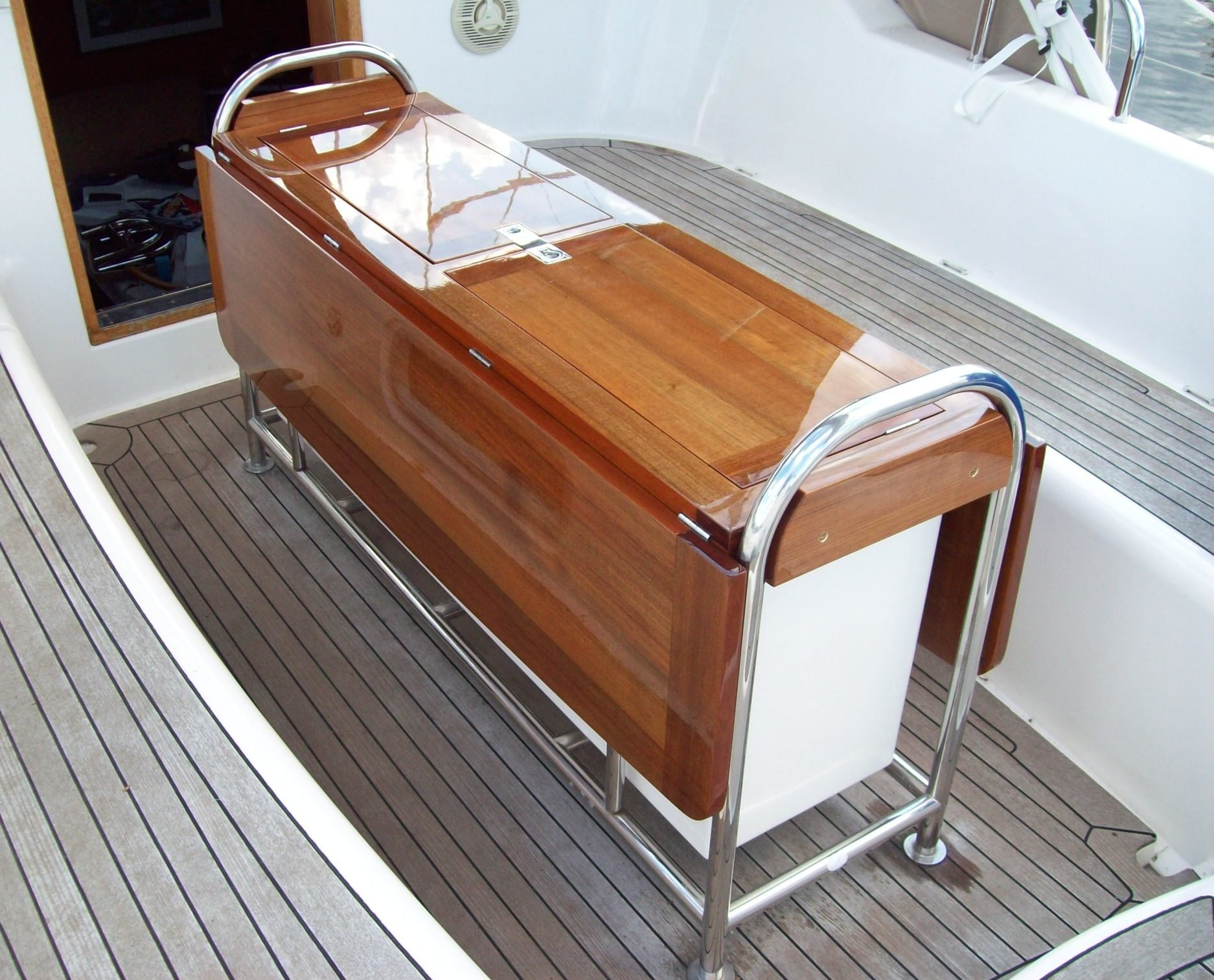 The additional work included the design and fabrication of a bespoke, stainless steel bowsprit; a welded Aluminium mast-head extension; custom Code-O sheave box fitted to the mast; installation of a Simrad 4g radar system; Yachtspot 4G Wi-Fi; refinishing of the cockpit table and the installation of Lewmar running backstay winches.