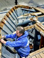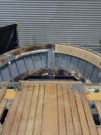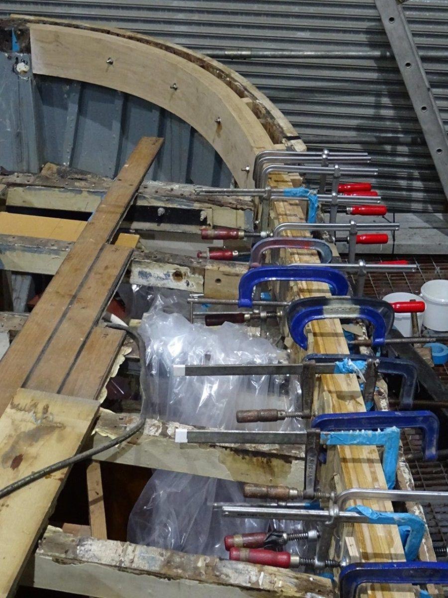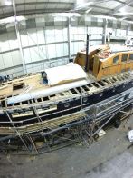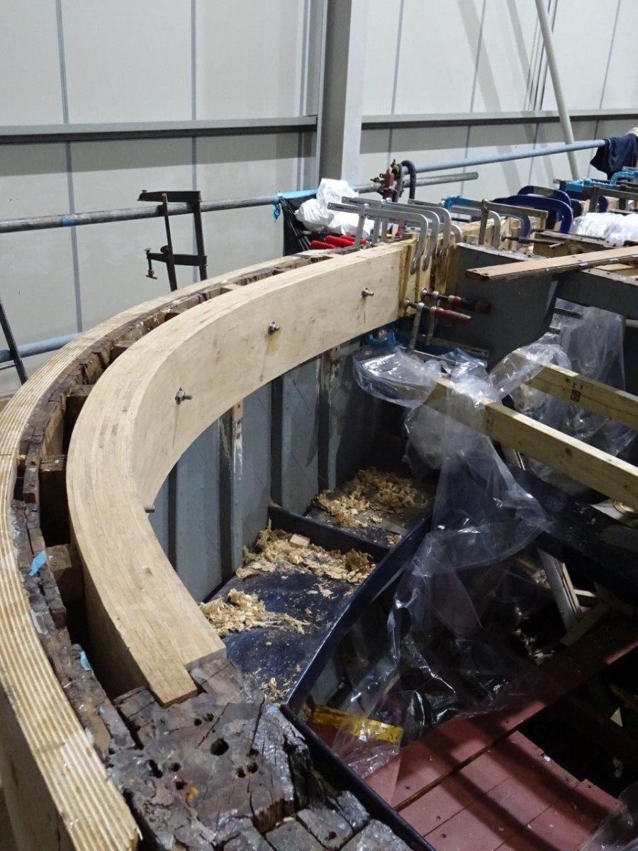 Ultimately much of the 10″ x 8″ solid oak beam-shelf, totalling around 180ft in length, along with the inboard carlin and associated intermediate oak deck beams, will be replaced. The hull has been carefully braced to ensure fair form is retained, whilst the transom sections are laminated in situ and localised repairs to original steamed timbers and upper sections of double diagonal teak hull planking are carried out.