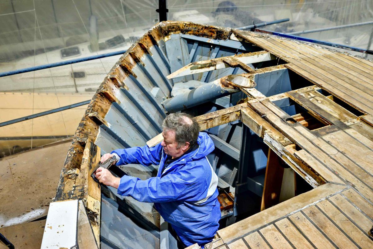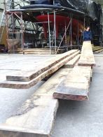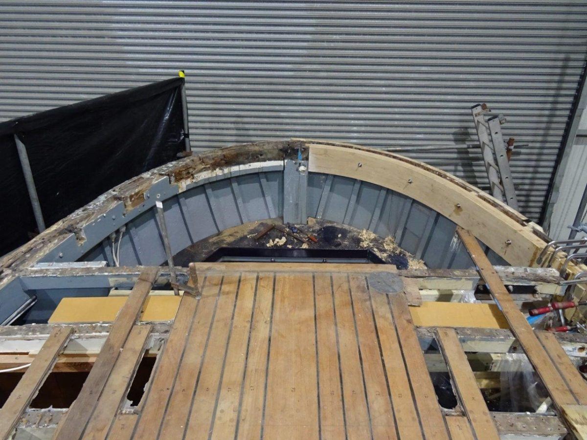 To allow this work to be carried out, the original solid teak deck and margins have been lifted plank by plank, carefully cleaned up and new caulking rebates machined in preparation for relaying over the new deck structure.