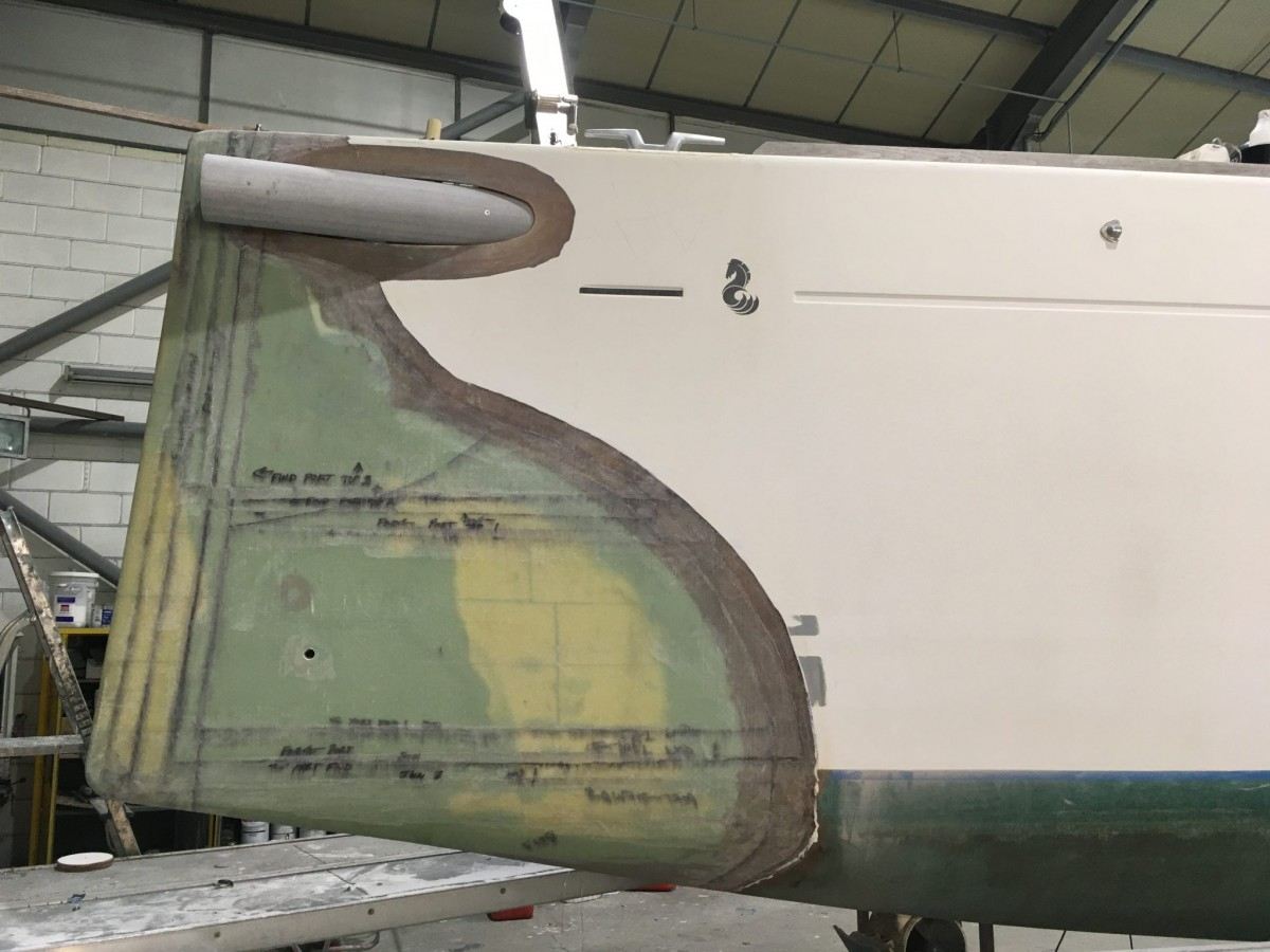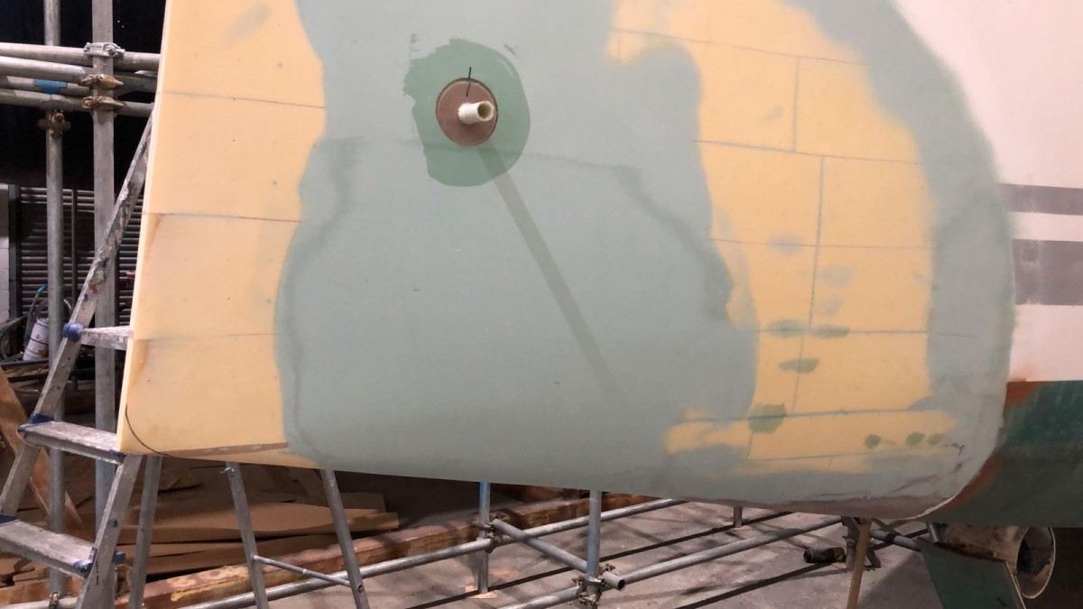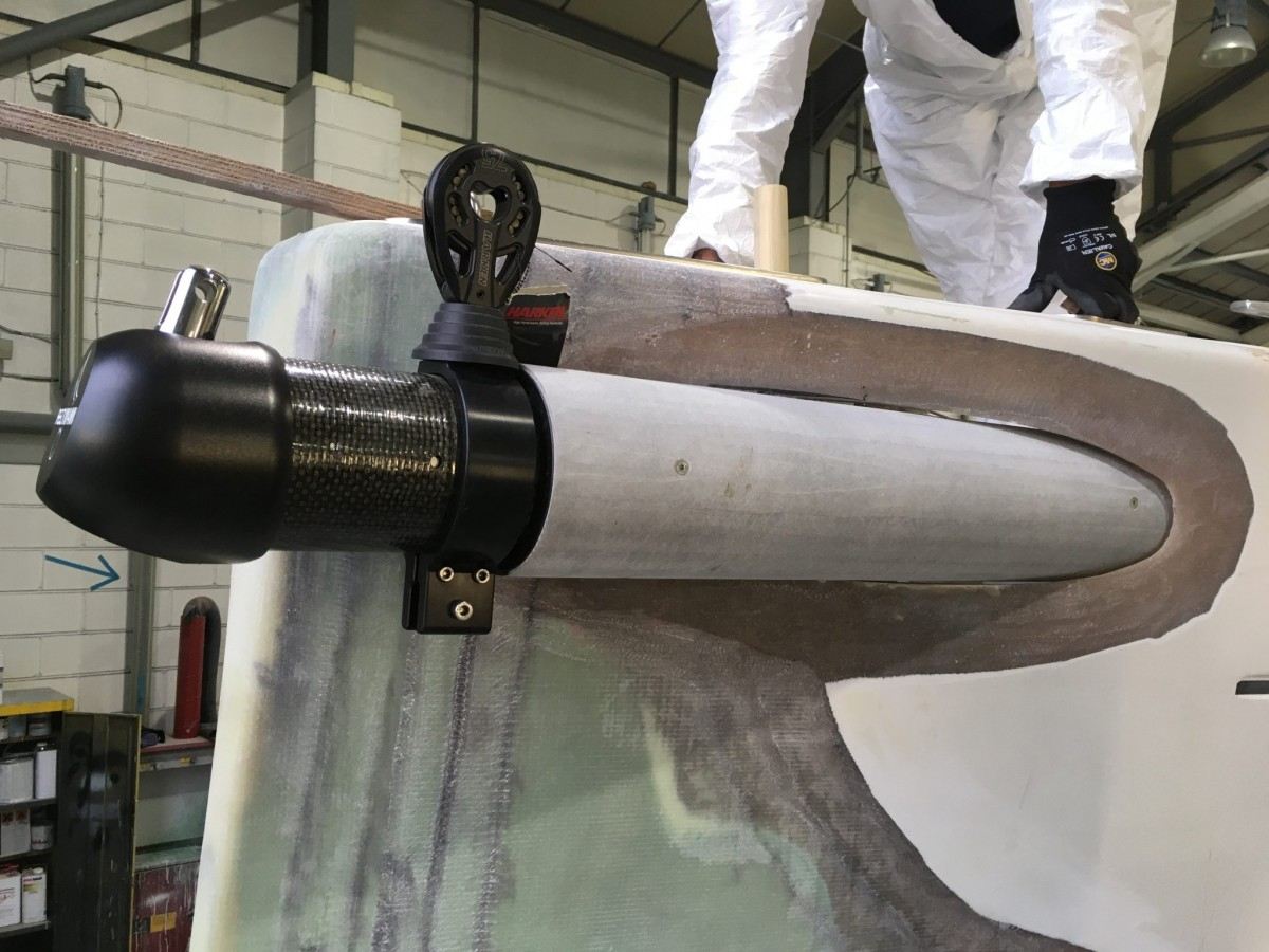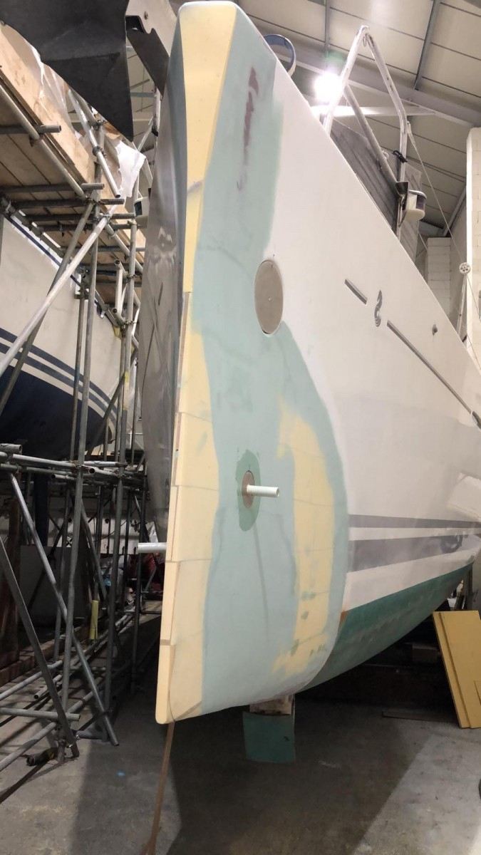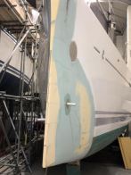 The new dreadnought bow profile and modified stern sections, incorporating a recessed bathing platform are complete and we are now installing a retractable hydraulic bow sprit assembly, prior to completing post curing, final fairing and topside repainting in stylish ‘Ford Performance Blue’.